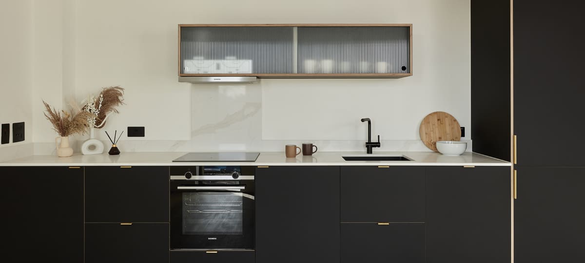 Le modèle de cuisine linéaire met en valeur l’intensité des façades en FENIX Nero Ingo sur du contreplaqué, associée à la touche lumineuse des poignées profilées en laiton. Ce design épuré et contemporain est complété par des éléments muraux en verre cannelé ainsi qu’un plan de travail et une crédence à l’aspect marbre.